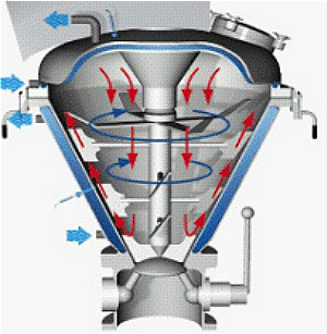 产品通过锥形混合腔顶部投入,投料范围在30%-100%之间,设备中间有一个顶部驱动的高速转轴,因此便去除了在产品区域的密封设计以及轴承。在轴上有紧贴内壁的桨式混合原件。通过高速旋转的搅拌桨和锥形内仓的共同作用将产品由底部带至混合腔的上部。当产品达到顶部的时候又重新回落到混合仓中心,如此的产品的方式形成了一种快速的宏观混合。